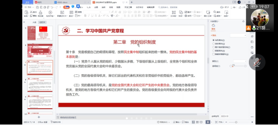 首先是例行活动,受疫情影响,活动采用线上形式,由支部书记带领支部成员齐唱国歌,重温入党誓词,并一起学习《中国共产党章程》的相关内容。