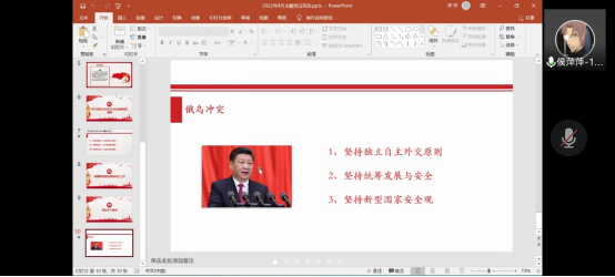 接下来,支部书记以PPT的形式带领支部成员了解学习俄乌冲突下,中国国家安全立场和相关做法。学习了有关俄乌冲突的人民日报钟声系列新闻报道,以及习近平总书记的相关讲话。俄乌冲突下的国家安全启示总体概括为三个方面:坚持独立自主外交原则、坚持统筹发展与安全、坚持新型国家安全观。
