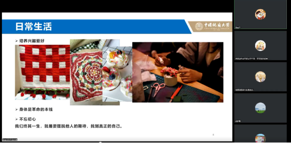 地质调查研究院研究生第三党支部黄丽文同志从科研工作、实践活动、日常生活三个方面分享学术科研故事。她从自身参与的项目讲起,回顾了本科时期参与的野外实习和访学活动,寄语学弟学妹——“我们终其一生,就是要摆脱他人的期待,找到真正的自己”。
