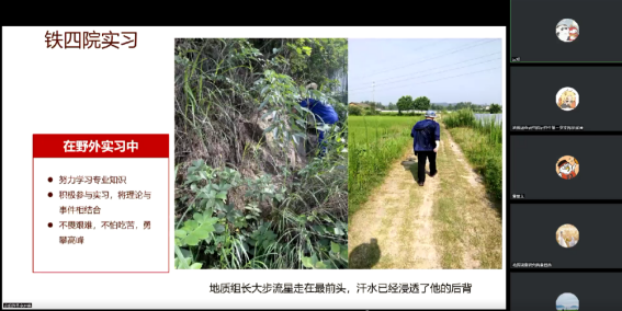 地质调查研究院研究生第一党支部皮聪同志从志愿服务、野外工作、科研工作三个方面分享自己的研究生生活。他在二十大报告中汲取奋进力量,向大家分享自己在铁四院以及项目中艰苦却有趣的实习经历,告诫学弟学妹不要害怕失败,学术科研是获取大量知识的有效途径,理论结合实践才会相得益彰。