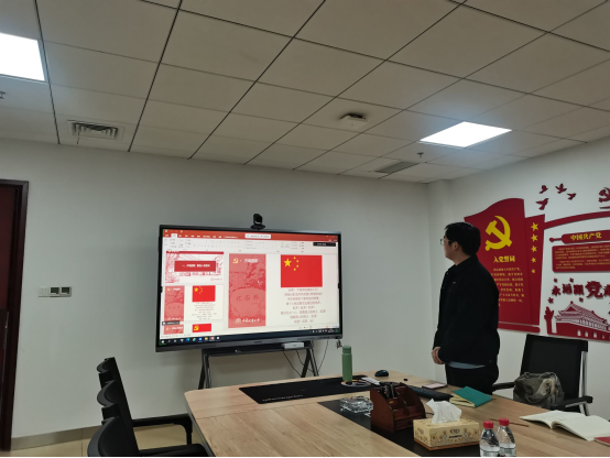 会议第一项,全体人员起立,行注目礼,奏唱国歌。第二项,全体党员齐声重温入党誓词。